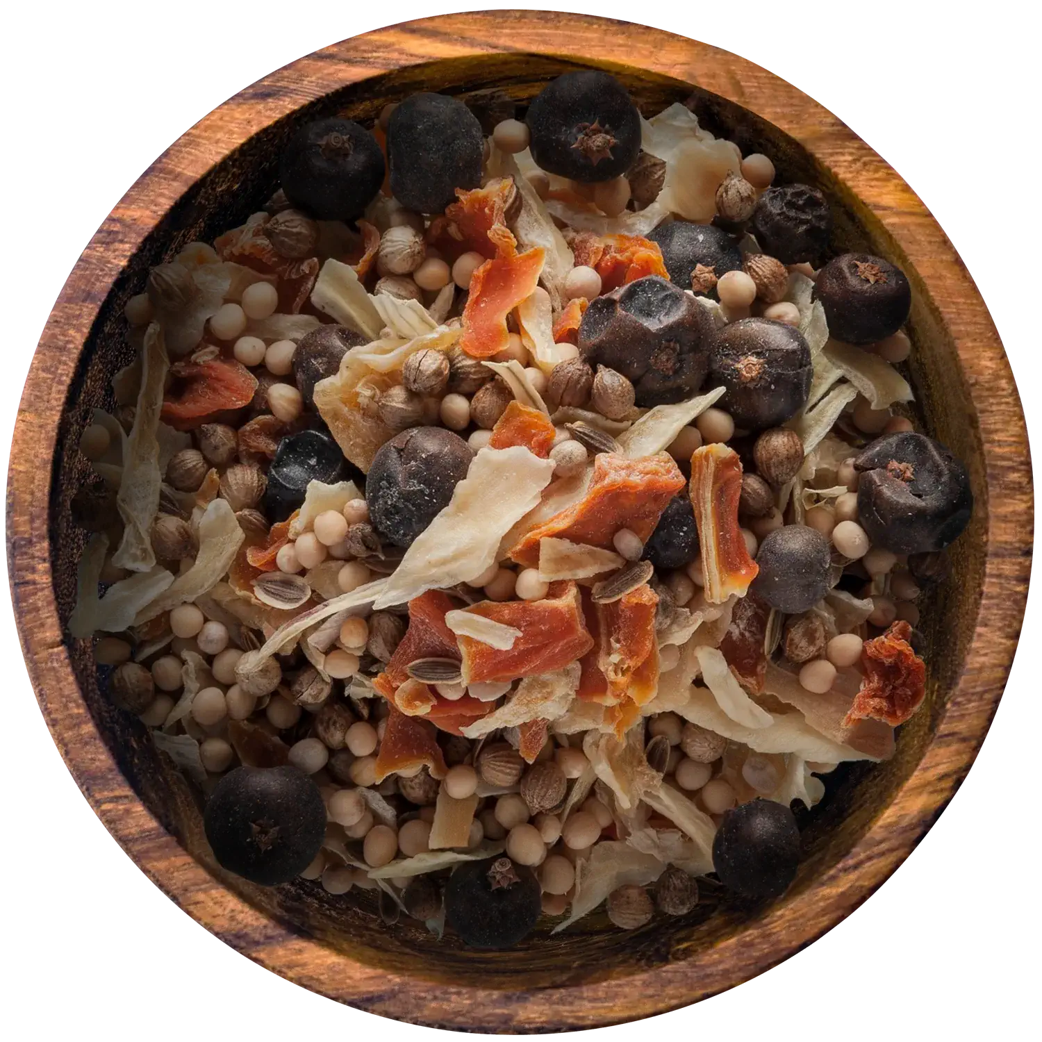 Senfsaat, Koriander, Karotten, Wacholderbeeren, Dill, Zwiebeln, Piment, Nelken